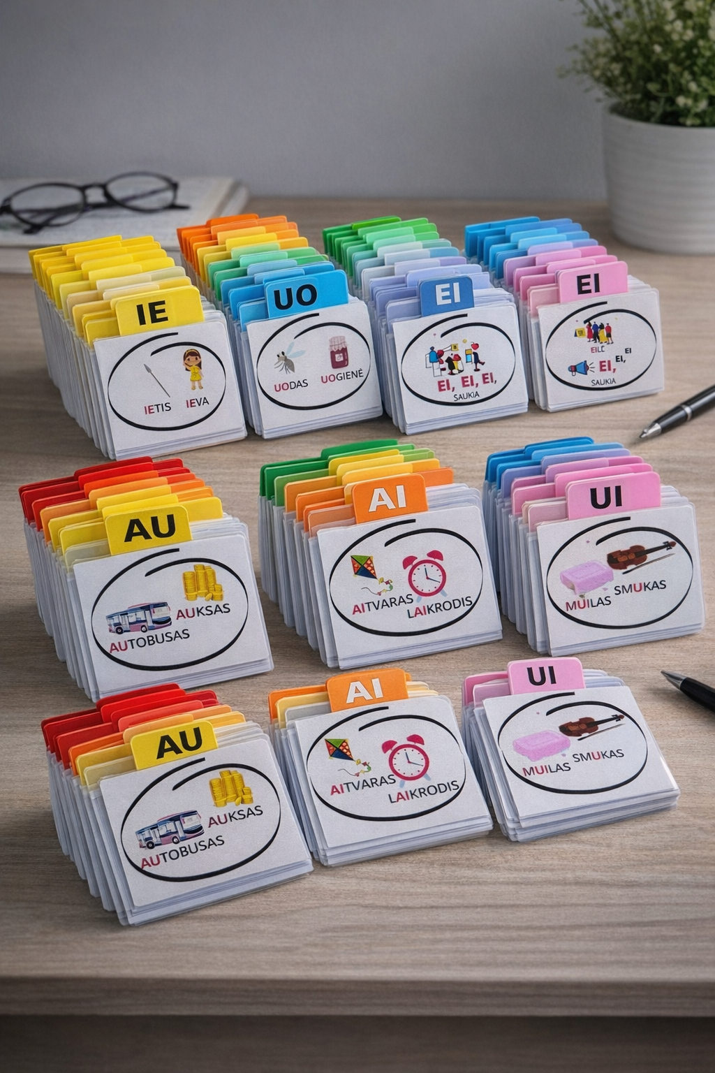Tai A4 formato lapai su spalvingomis iliustruotomis užduotimis, skirtomis vaikams mokytis dvibalsių (IE, UO, EI, AU, AI, UI). Kiekviename langelyje pateiktas dvibalsis, paveikslėliai ir žodžiai (pvz., ietis, Ieva, uodas, uogienė, auksas, autobusas ir kt.). Kortelės išdėstytos eilėmis ir pritaikytos kirpimui į atskiras juosteles ar korteles.